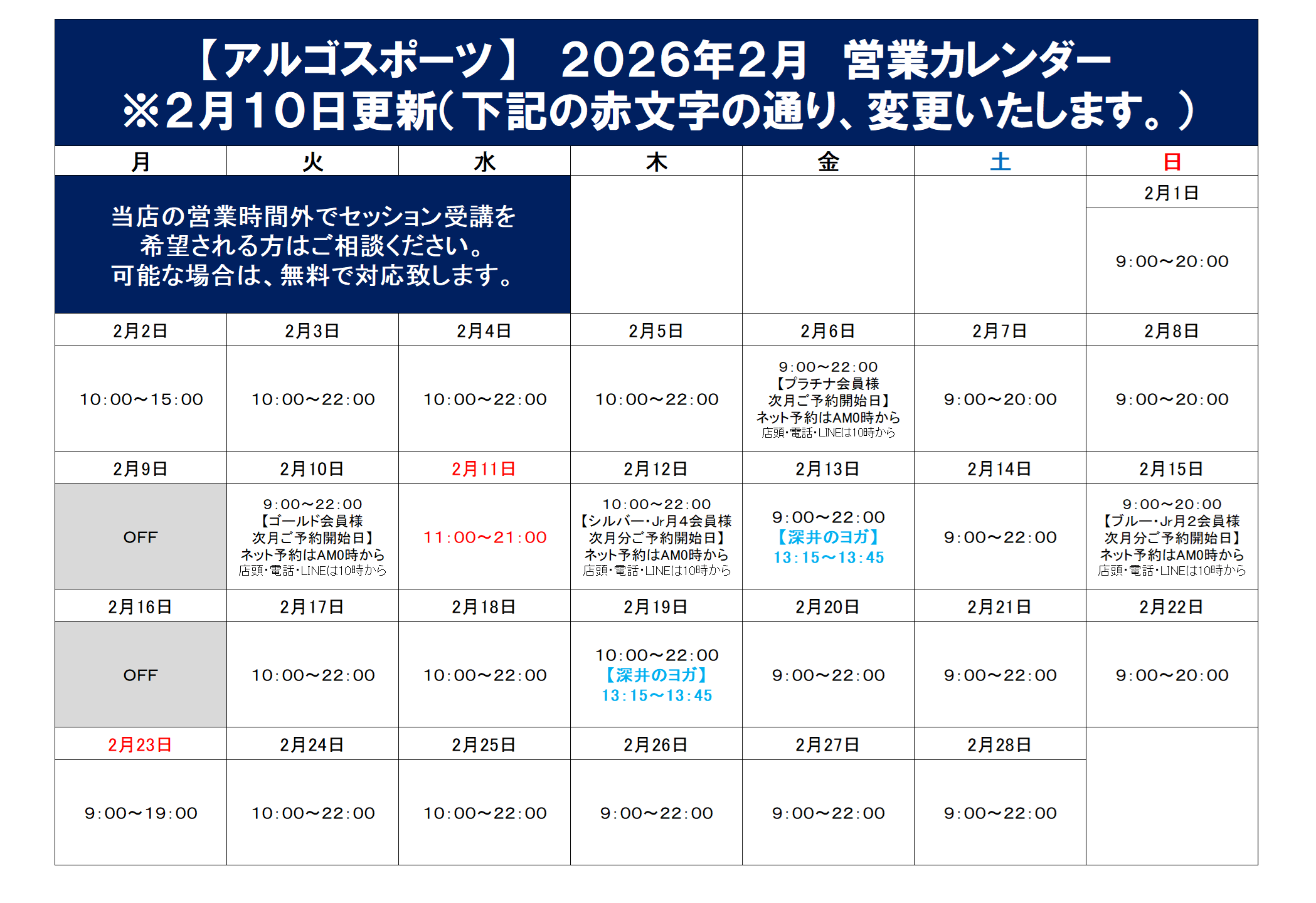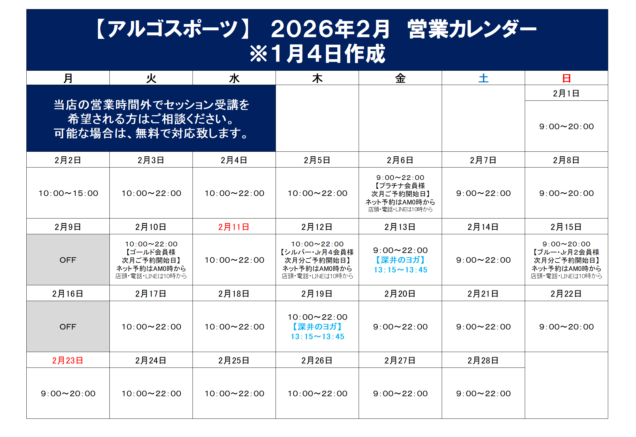 HOME > お知らせ一覧 > 2026年のお知らせ > 2026年2月 営業日・イベントスケジュールのご案内